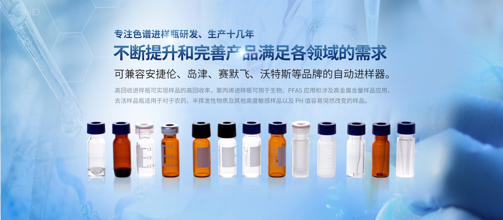 浙江哈邁科技有限公司(簡(jiǎn)稱(chēng)HAMAG),成立于2005年,總部位于美麗的海濱城市寧波,是中國(guó)優(yōu)質(zhì)色譜進(jìn)樣瓶、樣品瓶供應(yīng)商,是一家專(zhuān)業(yè)從事色譜耗材的科研、設(shè)計(jì)、生產(chǎn)、銷(xiāo)售和系統(tǒng)集成為一體的生產(chǎn)型企業(yè)。經(jīng)過(guò)十幾年的研發(fā)與努力,通過(guò)和國(guó)內(nèi)外多個(gè)科研部門(mén),浙江大學(xué)理工學(xué)院,同時(shí)與品牌:安捷倫、沃特世、島津等公司的技術(shù)交流與學(xué)習(xí),我們成功的研制開(kāi)發(fā)出實(shí)驗(yàn)室分析設(shè)備專(zhuān)用的各種型號(hào)的自動(dòng)進(jìn)樣瓶、頂空瓶及其配套蓋墊;特氟龍與硅膠復(fù)合墊片;特氟龍/硅膠制品;創(chuàng)新型固相萃取儀;針式過(guò)濾器等幾十種實(shí)驗(yàn)室耗材及關(guān)聯(lián)產(chǎn)品...